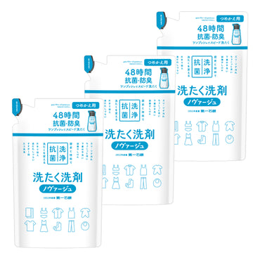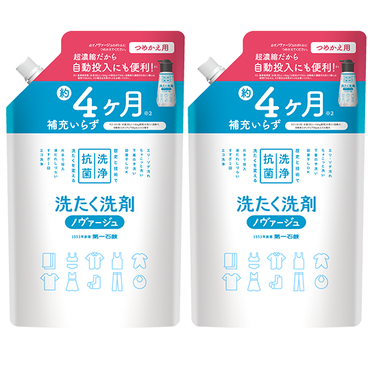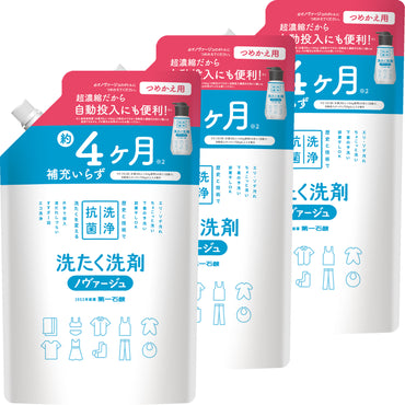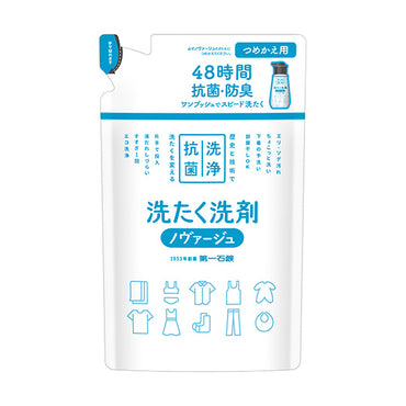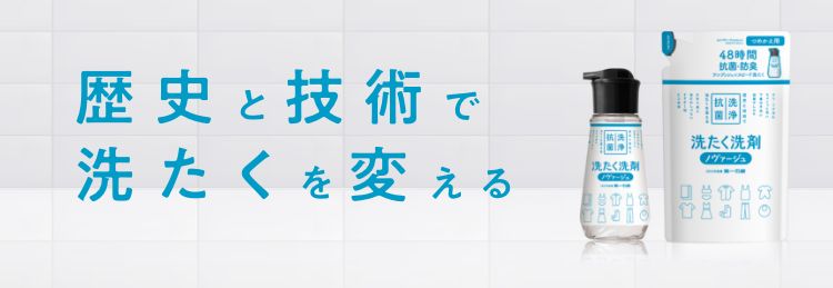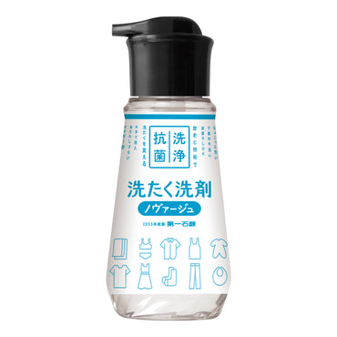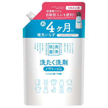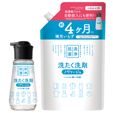ノヴァージュは通常の60%の使用量(当社比)でしっかりと汚れを落とすことができる超濃縮衣料用液体洗剤です。1953年の創業以来あらゆる洗剤を作り続け、研究を重ねてきた第一石鹸が洗たく洗剤に必要な機能を詰め込んだ自信作です。
